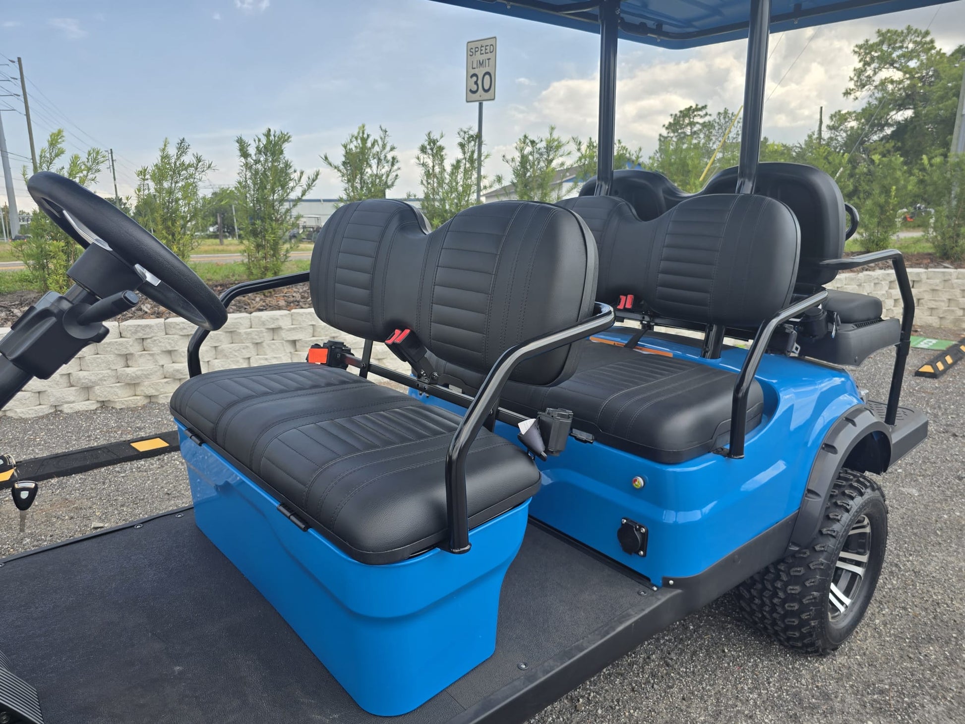 This golf cart is loaded with class-leading features like 12″ aluminum wheels, 4-wheel disc brakes, powder-coated steel chassis, lights, turn signals, high-speed rear ends, heavy-duty forward brush guard, durable front and rear bumpers, fender flairs, painted rooftops, horns, digital gauges, and more.