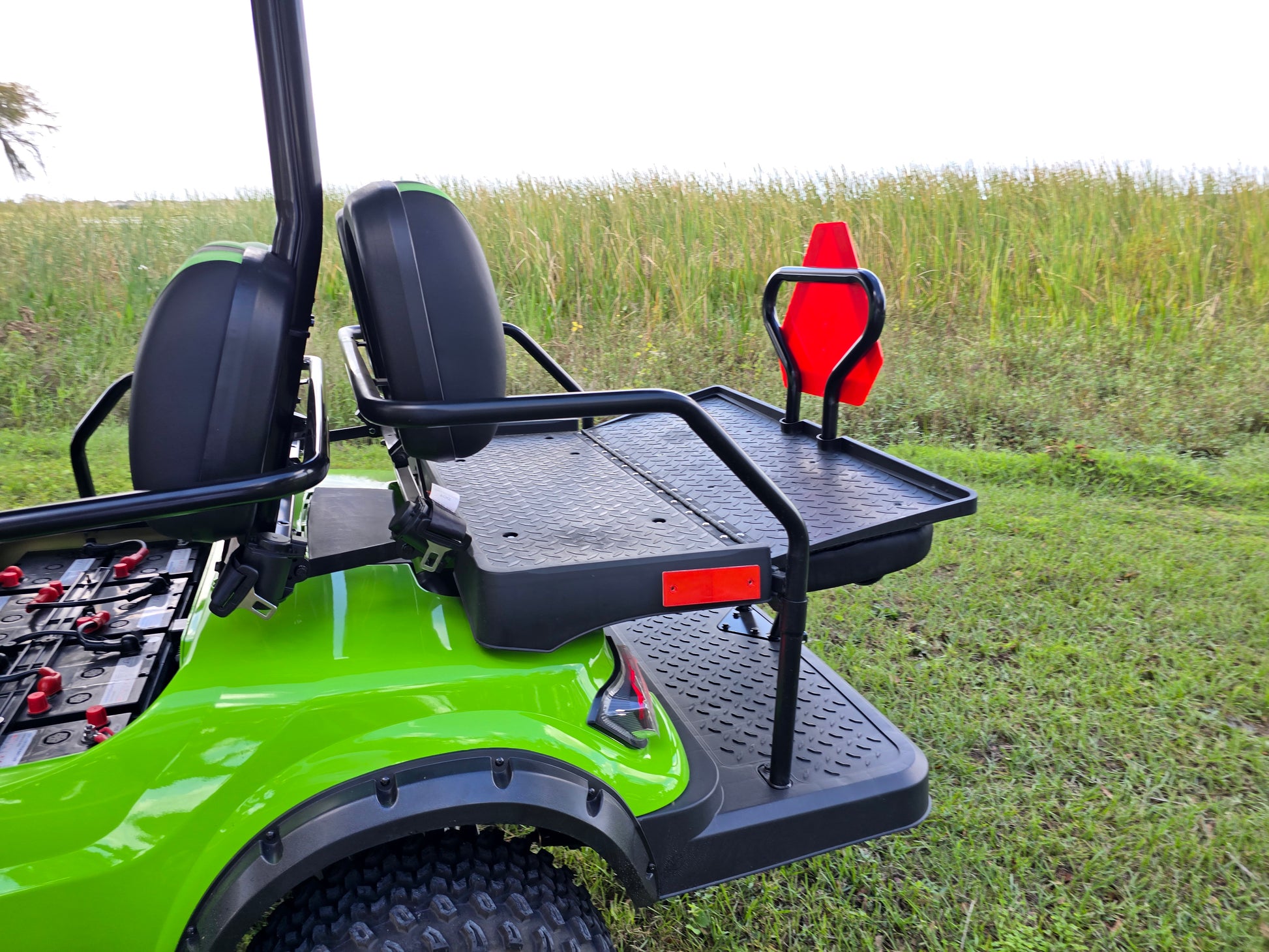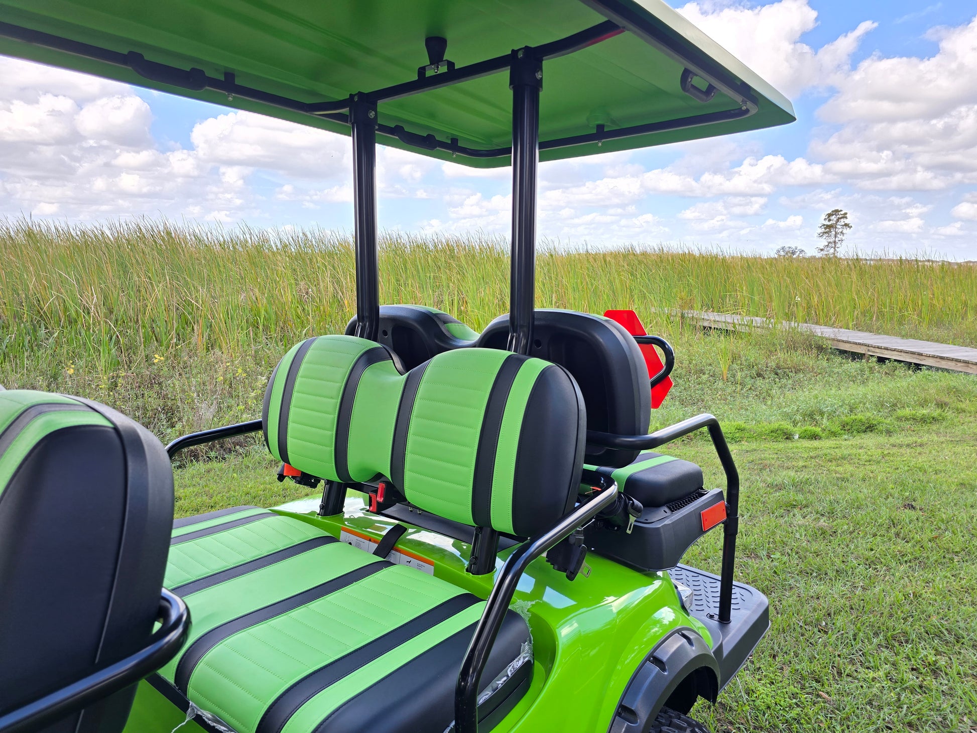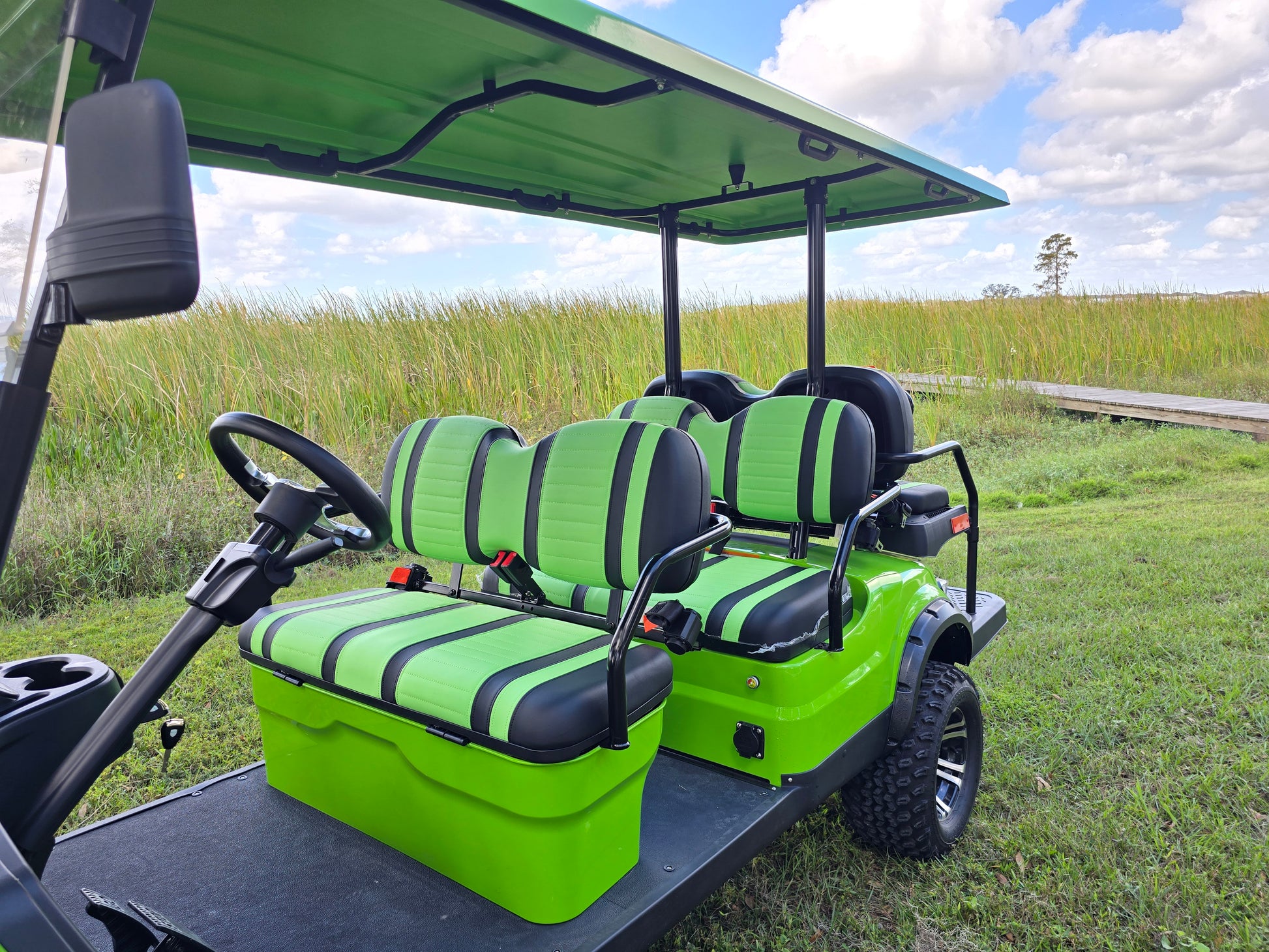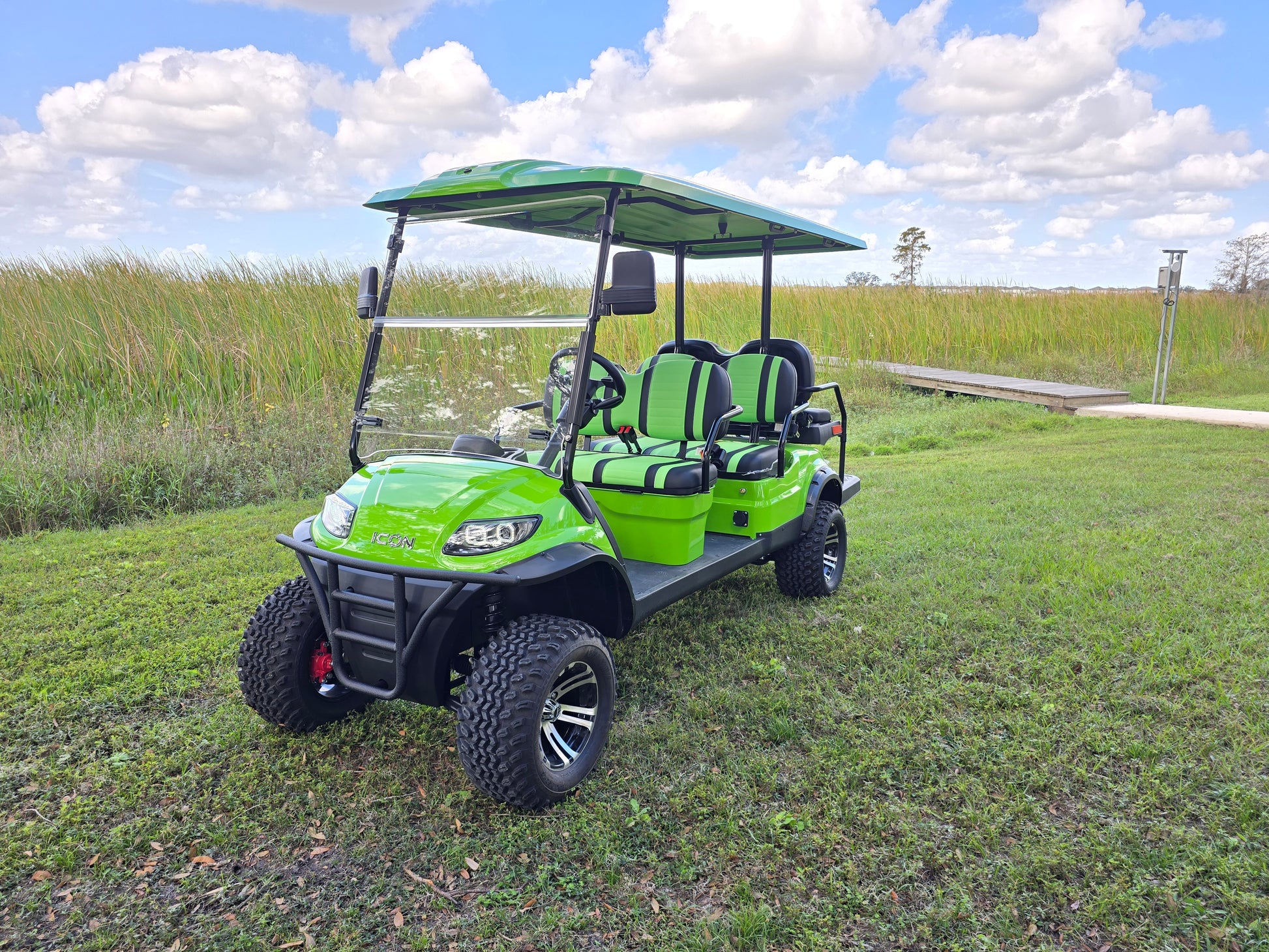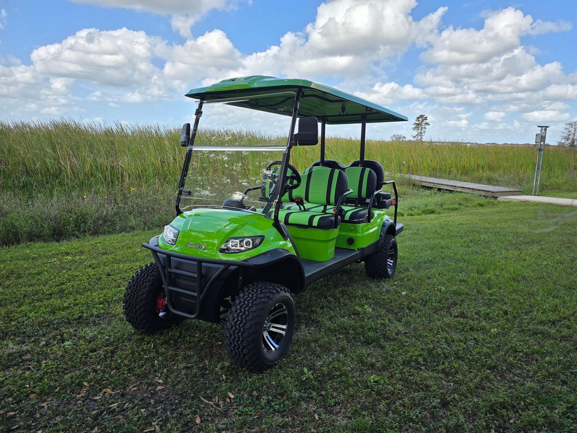 The 2024 ICON i60L is a lifted six-seater golf cart designed for both comfort and performance. It runs on AGM batteries and is powered by a 48V high-torque motor, offering reliable and efficient performance. The cart is equipped with a user-friendly LCD screen, plush seating, rear cooler/storage, and stylish rims. Safety features include seat belts, mirrors with integrated turn signals, a reverse buzzer, and an electromagnetic parking brake system. The suspension system provides a smooth ride with Macpherson-style independent coil-over shocks at the front and a solid axle coil-over shock with a stabilizing bar at the rear. Perfect for residential and commercial use, it ensures a balance of style, commercial use.