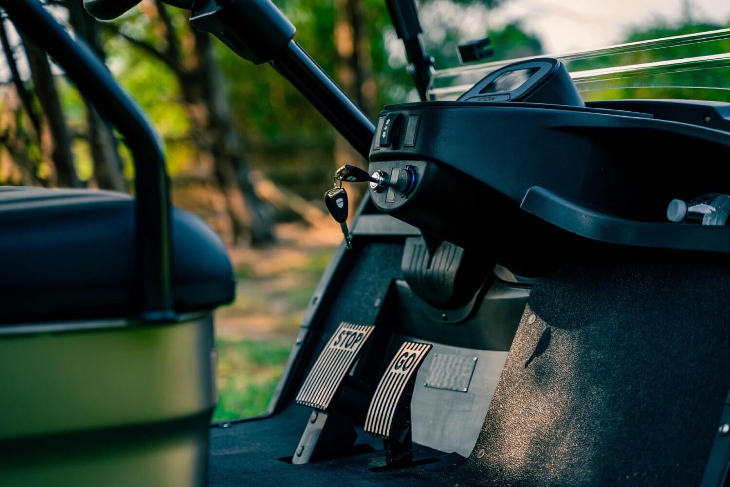 - Dash Components: Includes a forward/neutral/reverse switch, USB and 12V plugs, cubby storage, multiple cup holders, key switch, and instrumentation cluster.